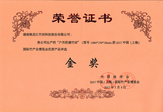湖南桃花江竹材科技股份有限公司生產(chǎn)的戶外防腐竹地板在2017年7月中國(上海)國際竹產(chǎn)業(yè)博覽會(huì)中榮獲金獎(jiǎng),該獎(jiǎng)項(xiàng)由中國林學(xué)會(huì)、中國(上海)國際竹產(chǎn)業(yè)博覽會(huì)頒發(fā)。湖南桃花江竹材科技作為中國竹材領(lǐng)域高炭防腐技術(shù)的發(fā)明人,在中國竹材領(lǐng)域有著舉足輕重的地位。湖南桃花江竹材科技一直專注與于竹材的戶外運(yùn)用研發(fā)與創(chuàng)新,為全球客戶提供高品質(zhì)竹材。